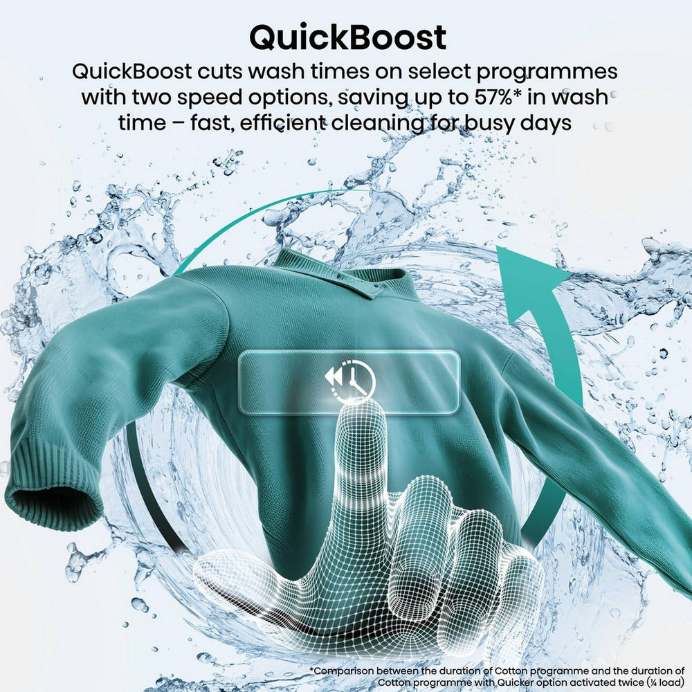 Designed for busy households, this washing machine includes intelligent time-saving and energy-efficient features. Quick Wash Pro provides tailored cycles for different load sizes — complete a full wash in under an hour or refresh smaller loads in just 15 minutes. The Cold Wash function reduces energy consumption by up to 71% by using lower temperatures with extended cycle times, while the Stain Removal feature automatically adjusts wash settings to target nine common stains for enhanced cleaning results with minimal effort.