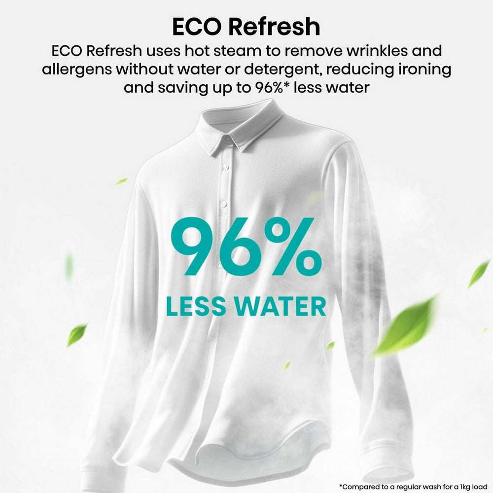 | Additional Information | ECO Refresh - Refresh your clothes the smart way with ECO Refresh. This innovative feature releases a powerful burst of hot steam into the drum, penetrating deep into fabric fibres to remove wrinkles and allergens – all without using water or detergent. Perfect for freshening up dry clothes, ECO Refresh reduces the need for ironing, saving you time and effort, while also using up to 96% less water compared to a regular wash for a 1kg load. Effortless, eco-friendly and incredibly effective. |